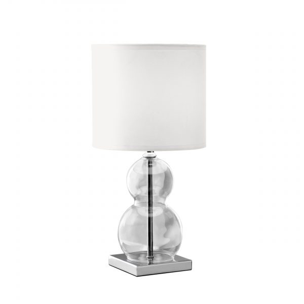 This modern classic Chloe table lamp provides a sophisticated edge to lighting. The clear glass base coupled with the poly silk drum shade creates a welcoming atmosphere.