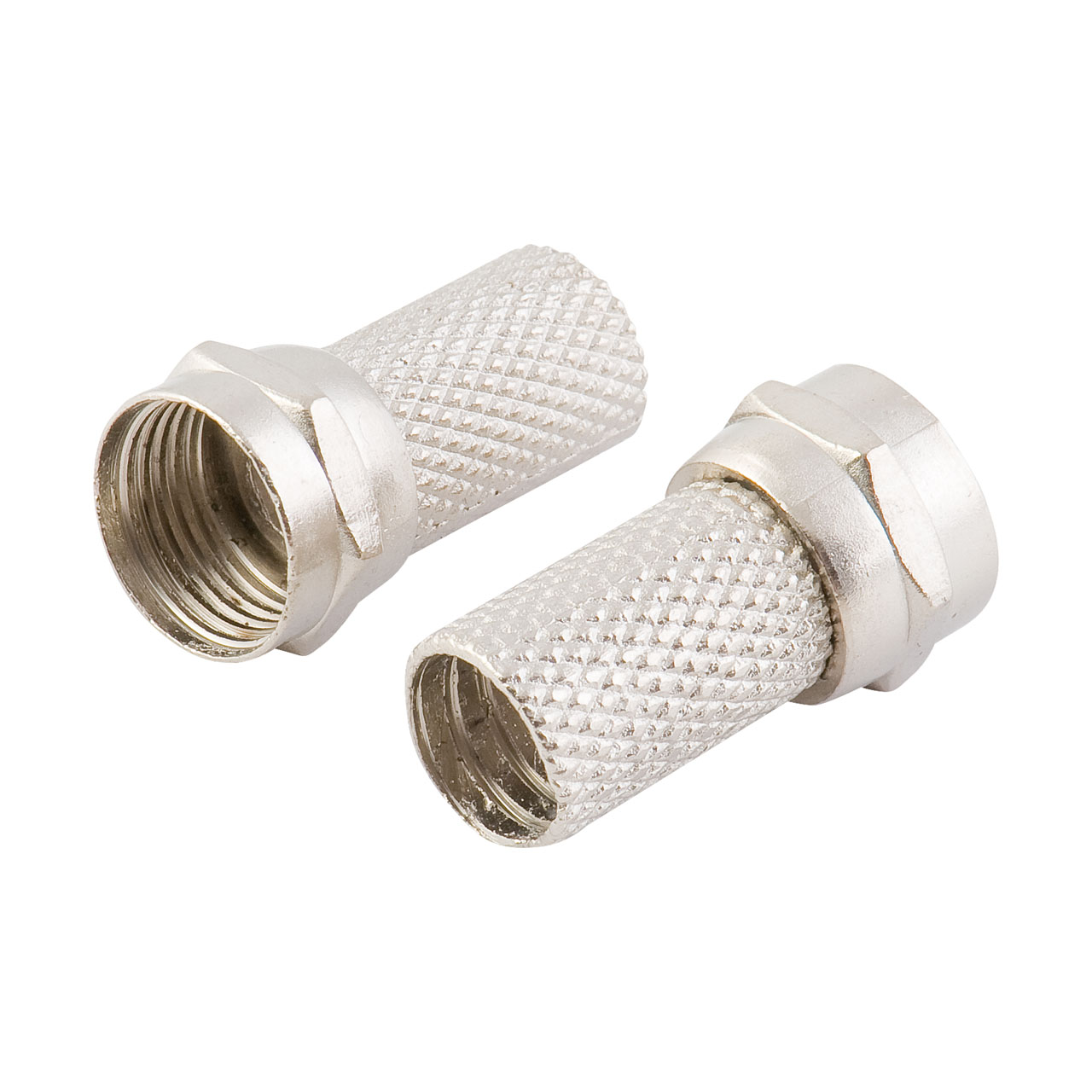 This twist on connector is used to terminate all RG6 coaxial cable types. The benefit to using a twist on type is that it does not require a crimp tool to finish it off. As an F connection, the coaxial cable conductor is used as the medium for connection of the signal.