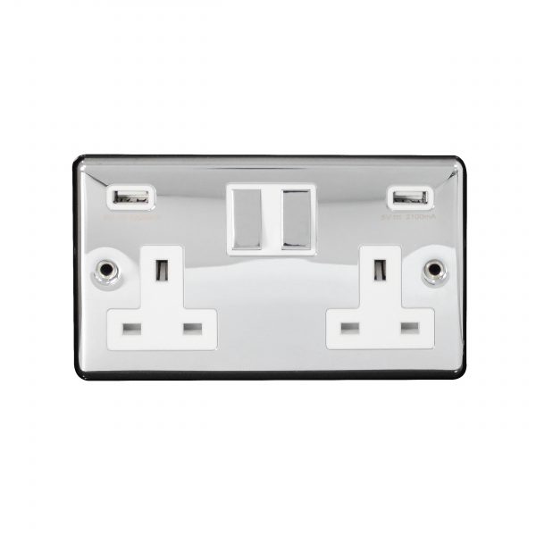 Switched Socket 2 Gang SP 13A & 3.1A USB Charger Screwed Polished Chrome