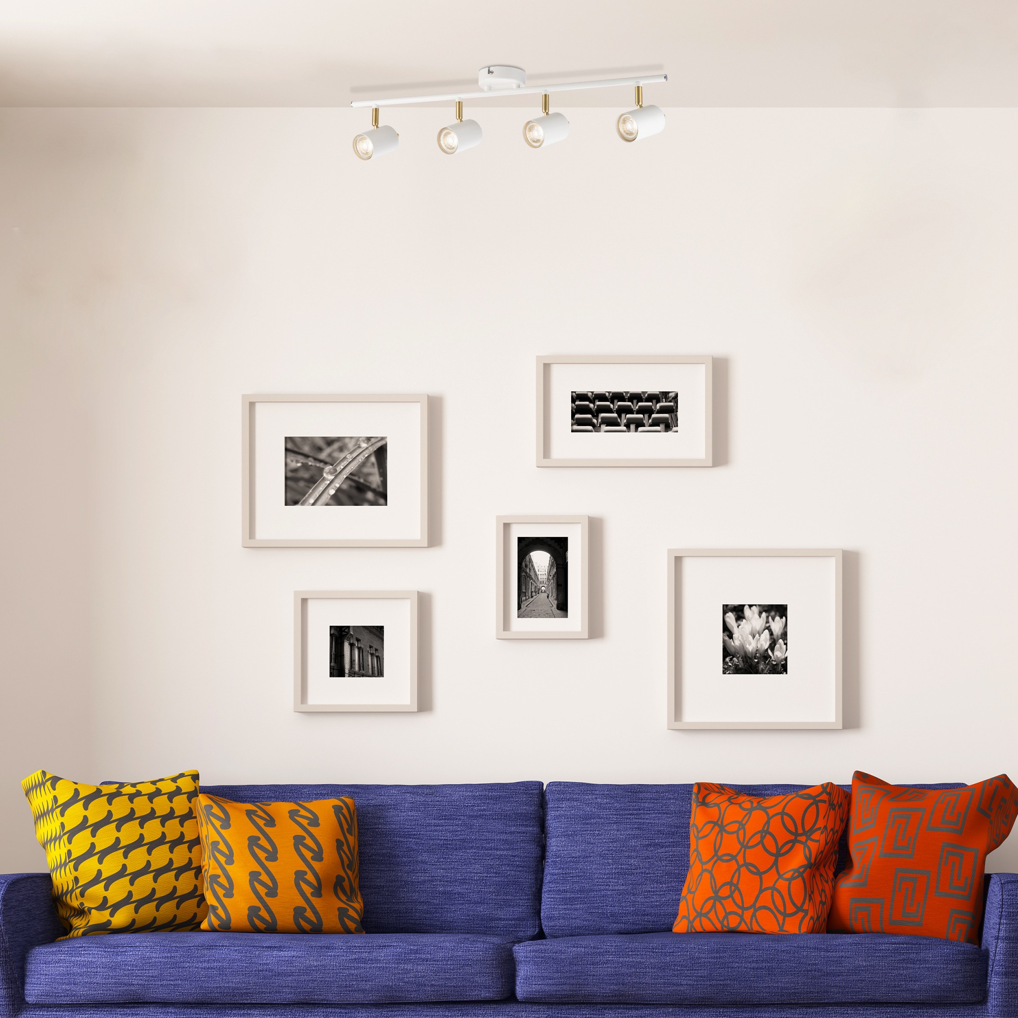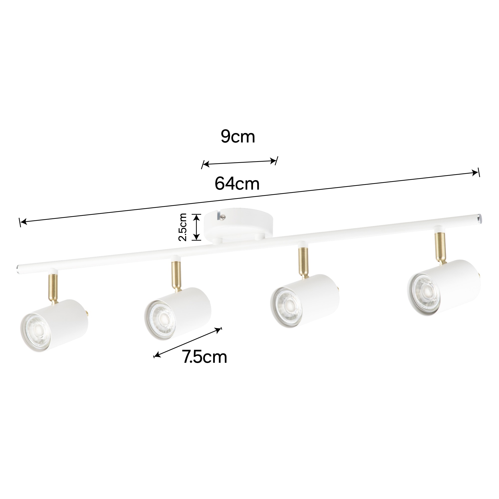 The Thorpe spotlight is cool and comtemporay. The white metal finish with gold trim is a great colour combo and gives the light a scandi vibe. The  4 fully adjustable lamps are fully adjustable and take replaceable GU10 bulbs. This is a great trend light to add to your range or to light up your home.