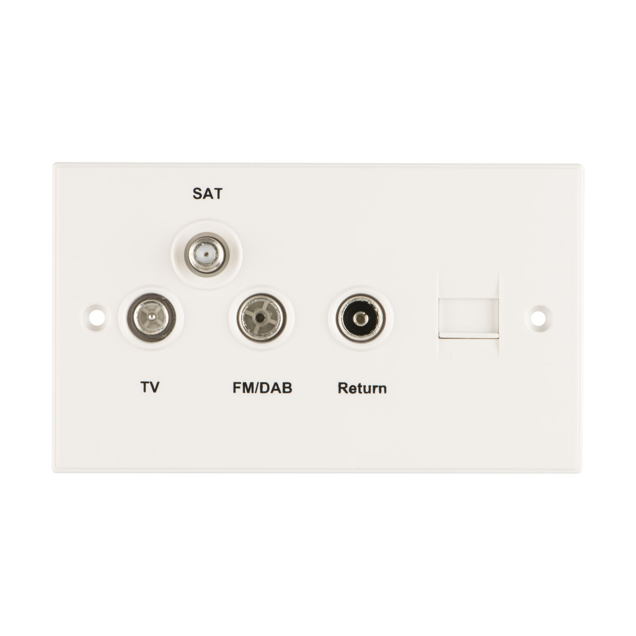 This socket provides a connection point TV, FM radio, satellite & telephone. This socket is part of our comprehensive range of square edge profile switches and sockets.